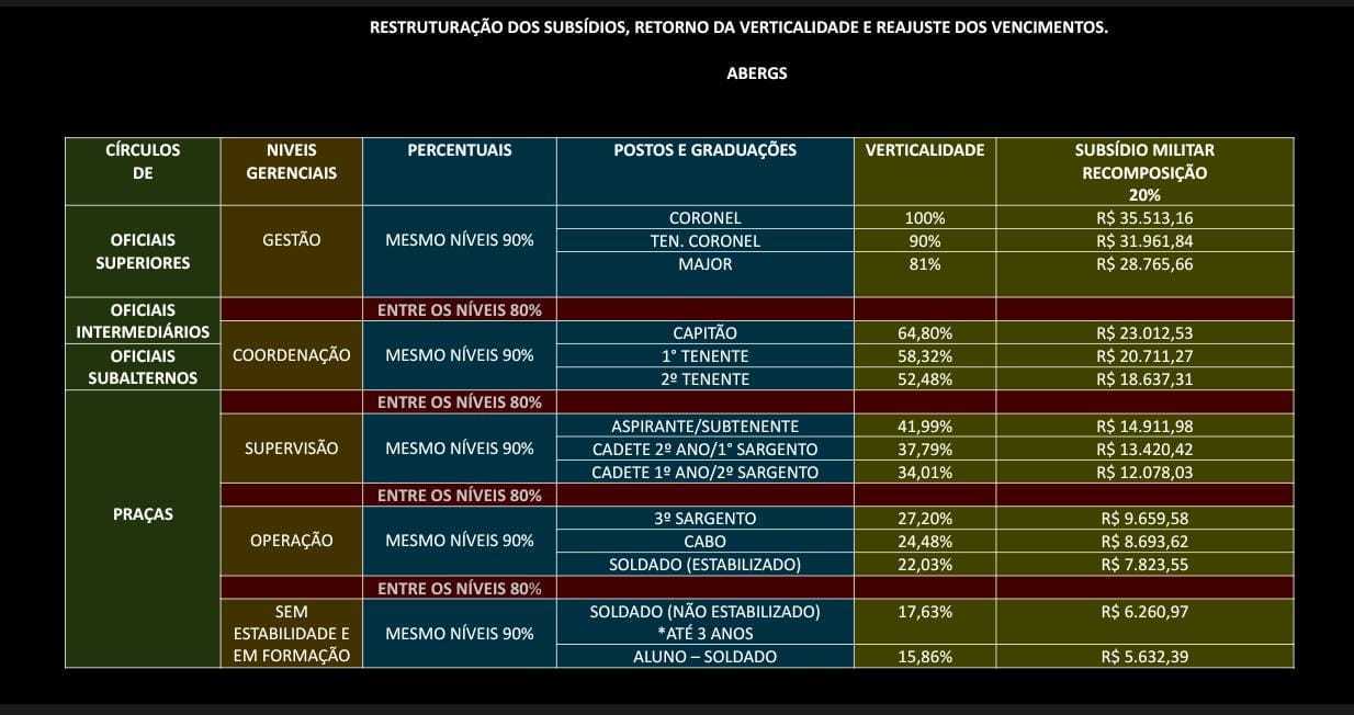 A Associação de Bombeiros do Estado do RS – ABERGS, a partir da gestão passada, entregou no mês de abril de 2023 para a secretária de Planejamento, Orçamento e Gestão - SPGG, do Governo do Estado, Danielle Calazans; e o secretário adjunto, Bruno Silveira; tabela com proposta de restruturação dos subsídios, retorno da verticalidade e reajuste dos vencimentos.