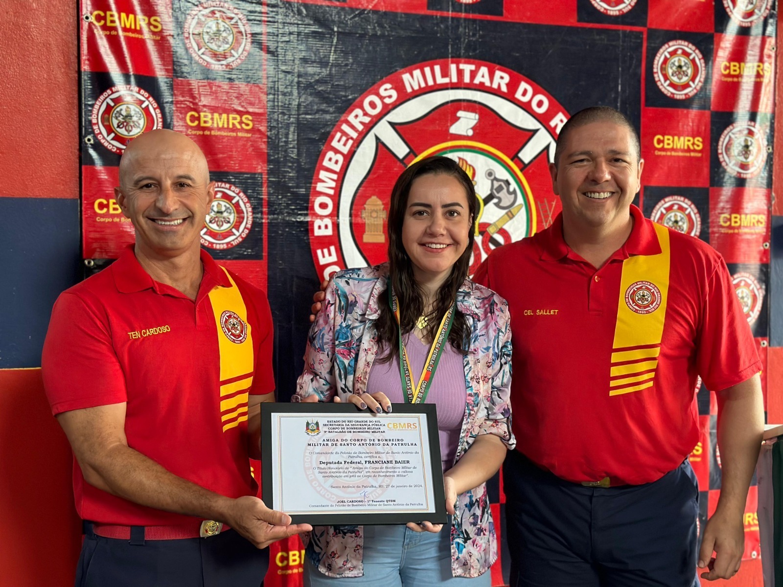 “Um dos princípios norteadores dos homens de bem é a gratidão. E é com esse sentimento que recebo este mimo, que muito me honra e que agora faz com que eu seja muito mais comprometida com o Corpo de Bombeiros Militar do Estado”, enfatizou a deputada federal Franciane Bayer.