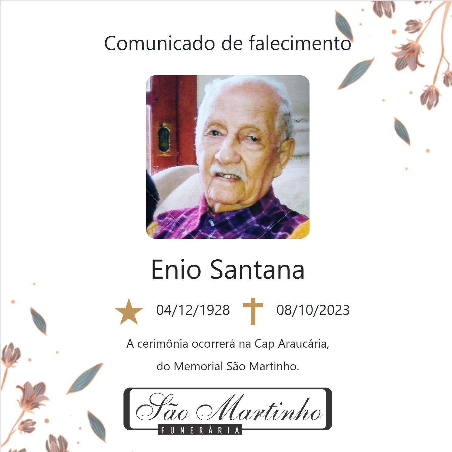 É com imenso pesar que a Associação de Bombeiros do Estado do RS - ABERGS, comunica o falecimento do 2° Sgt RR Ênio Santana, com 94 anos de idade, corrido no dia 08/10/23, na Cidade de Santa Maria.