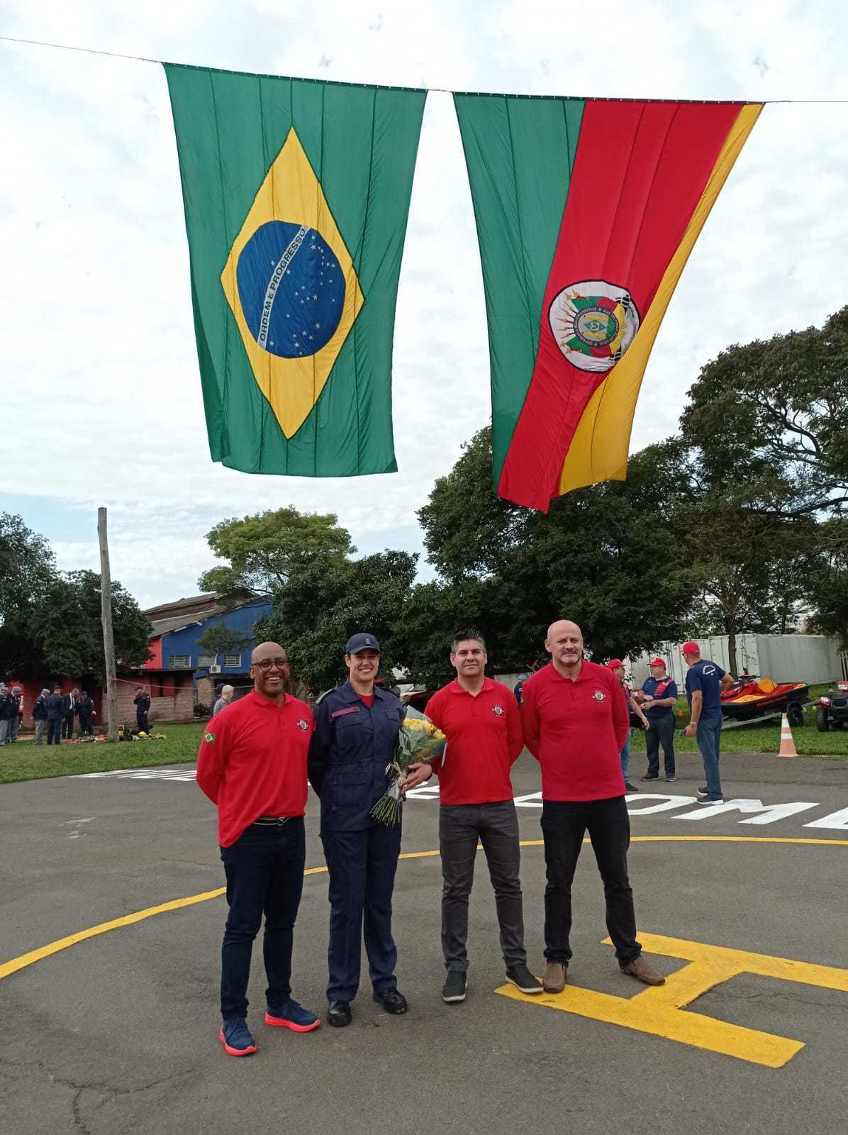 Após a solenidade, o Coordenador-Geral, acompanhado dos Coordenadores Geral-Adjunto e de Secretariado-Adjunto, 1° Sargento Ubirajara Ramos e 2° Sargento Nelvio Rodrigues, entregaram um buquê de flores para a militar, parabenizando pela conquista e reafirmando o orgulho da ABERGS em ter como associada e coordenadora a 1° Tenente Coronel do CBMRS.