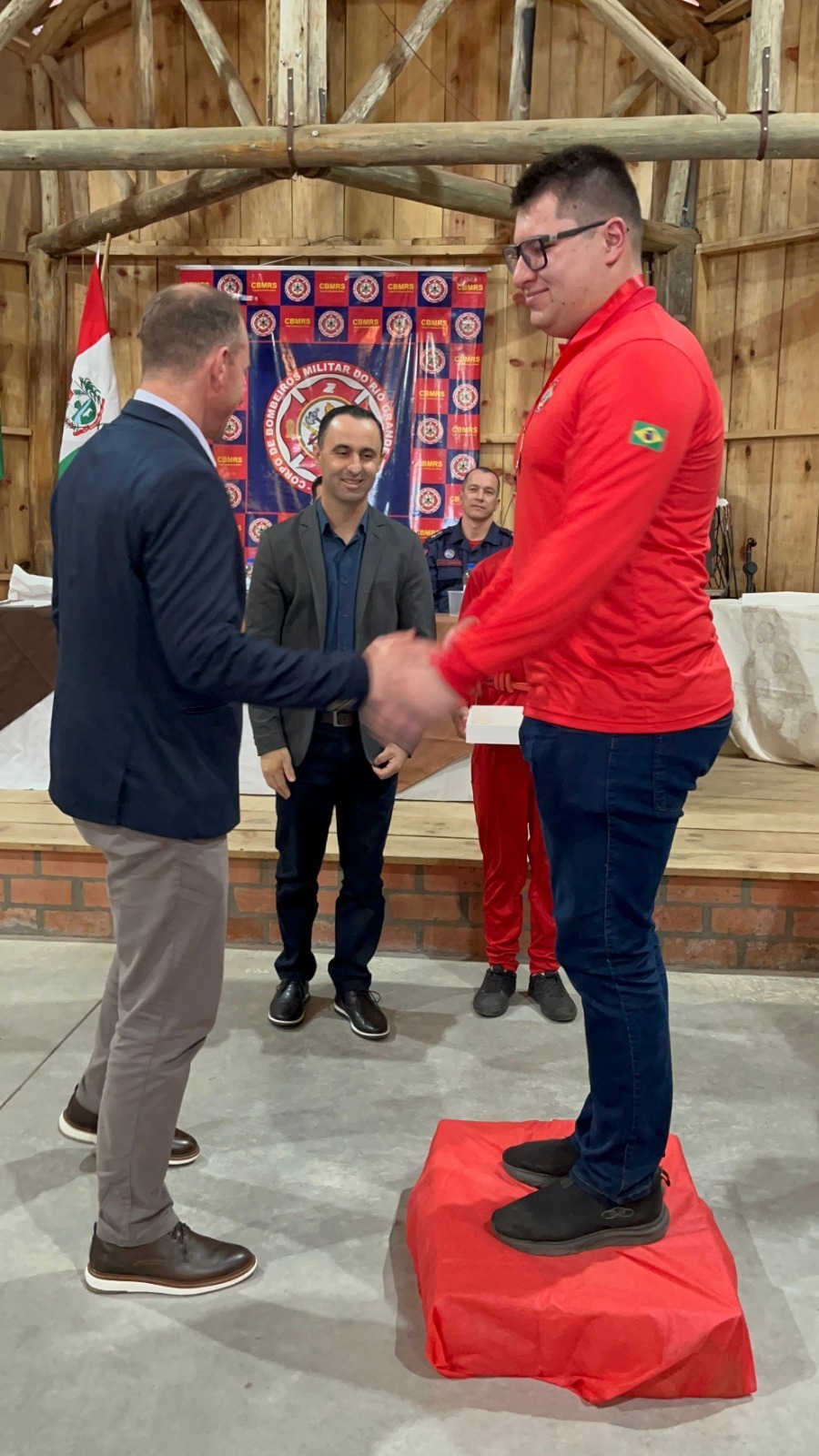O Coordenador do Núcleo Regional do 5º Batalhão de Bombeiro Militar (BBM) da Associação de Bombeiros do Estado do Rio Grande do Sul (ABERGS), soldado Felipe de Almeida Marcolin, participou na quarta-feira (09) da solenidade de formatura de 12 bombeiros voluntários no Curso de Formação de Civil Auxiliar de Bombeiro (SCAB), no município de Muitos Capões.