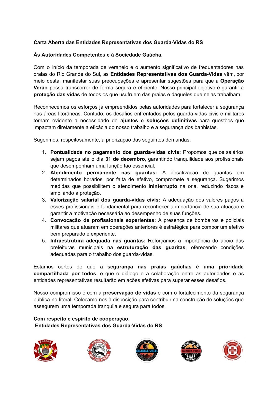 As entidades que assinam a Carta, destacam a pontualidade no pagamento dos Guarda-Vidas, atendimento permanente nas guaritas, valorização salarial dos guarda-vidas civis, convocação de profissionais experientes, e infraestrutura adequada das guaritas no Litoral Norte, Sul e Águas Internas.