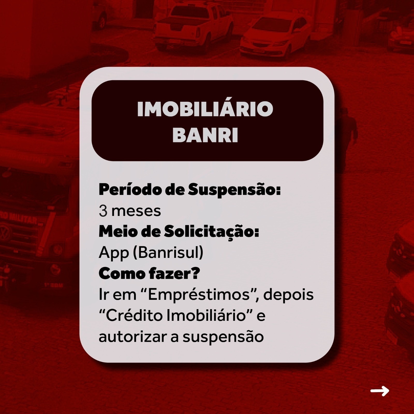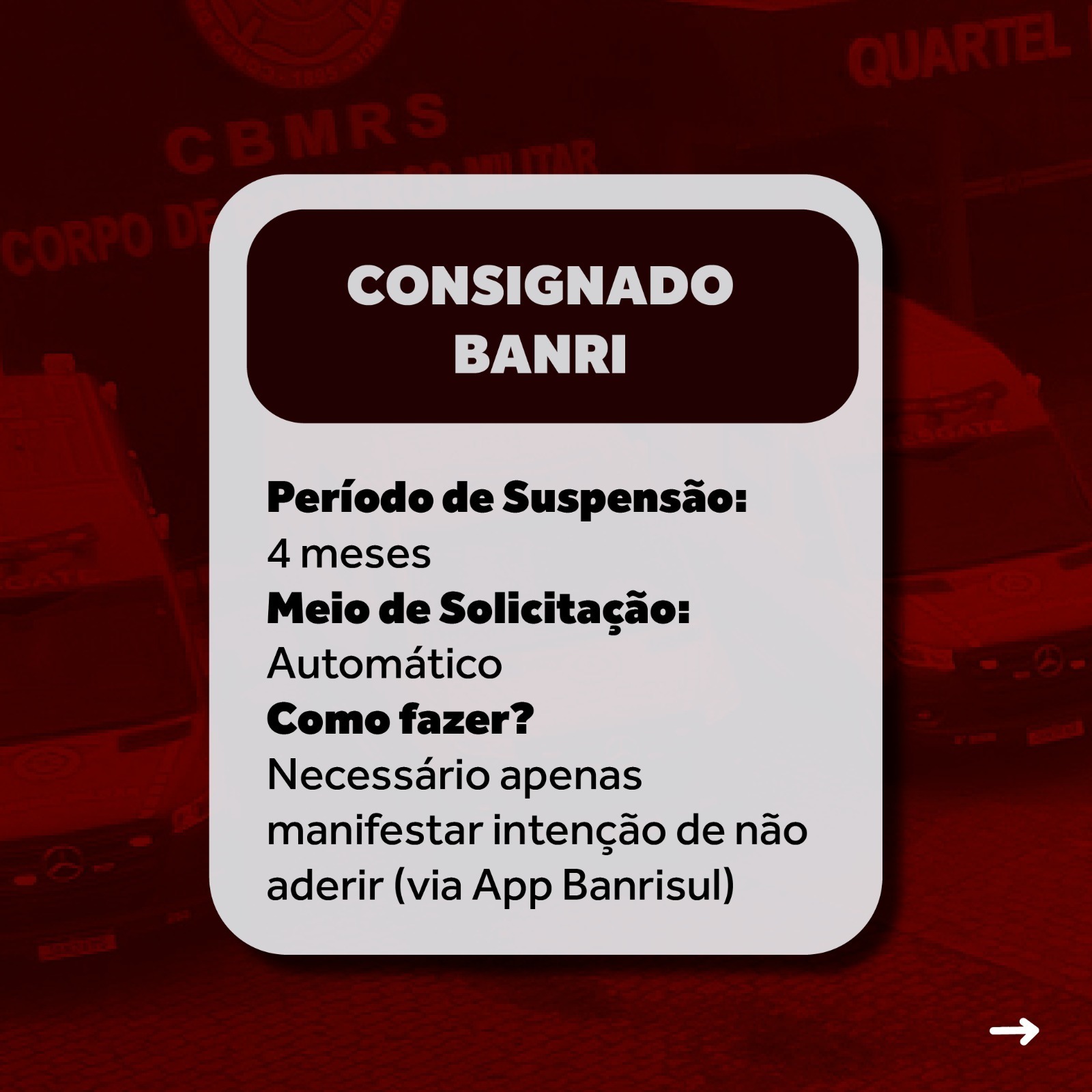 A Associação de Bombeiros do Estado do RS - ABERGS, esclarece aos associados Bombeiros Militares, sobre a suspensão de pagamentos de consignados e financiamento imobiliário, tanto no que diz respeito ao Banrisul e Caixa.